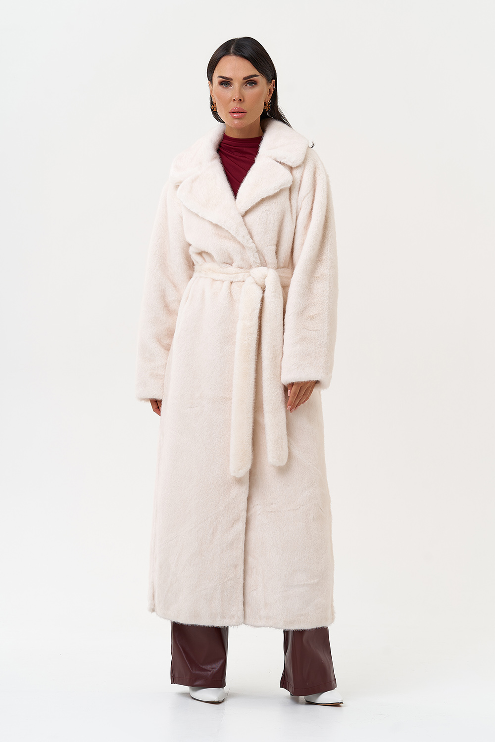 Фасон - прямой Длина изделия - 130 см Цвет - светло-бежевый (молочный) Материал - экомех Состав полотна - полиэстер 100% Подкладка - полиэстер 100% Вид застежки -крючки, пояс Вид ворота - английский воротник Фасон рукава - втачной, длинный |