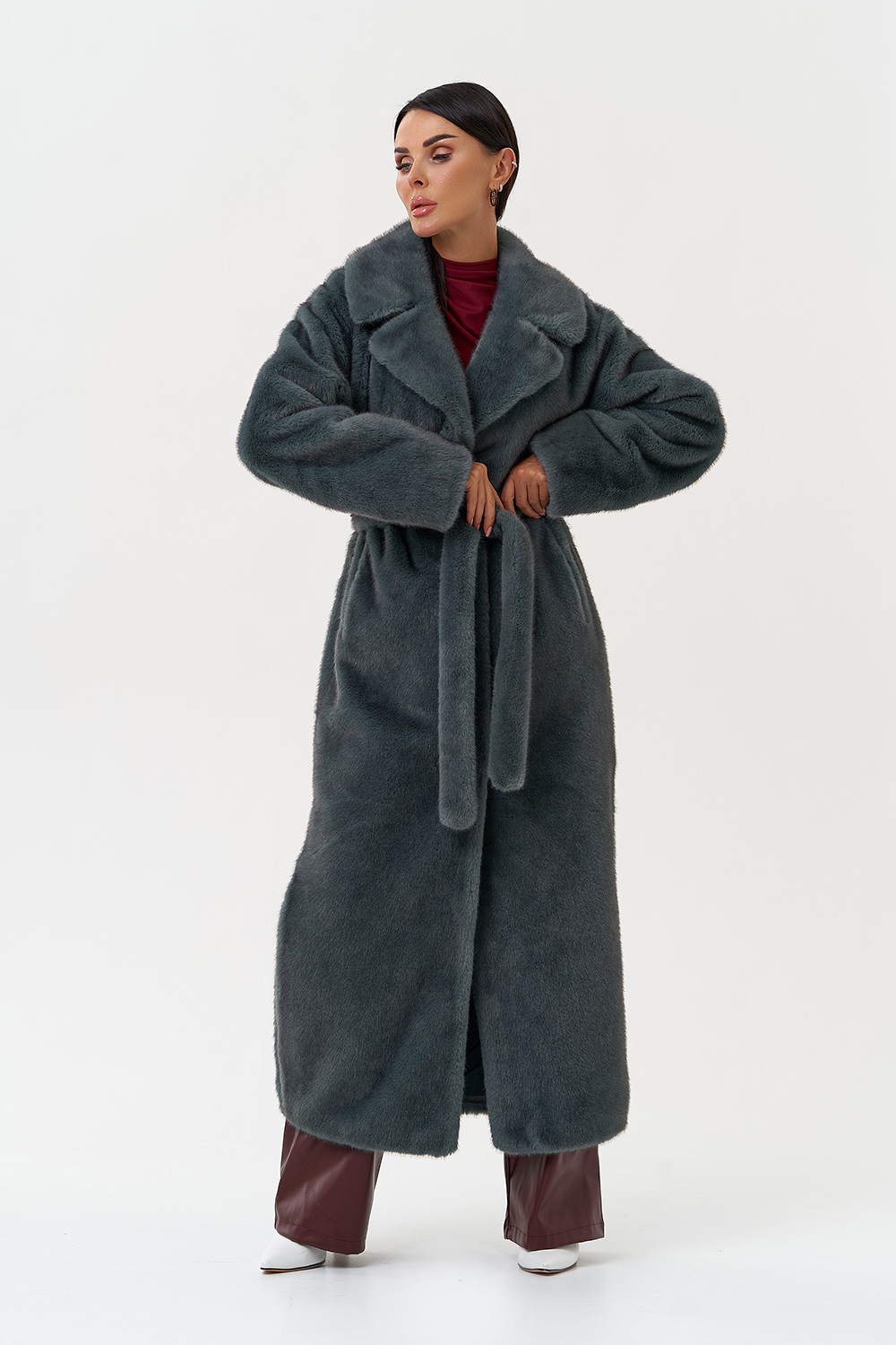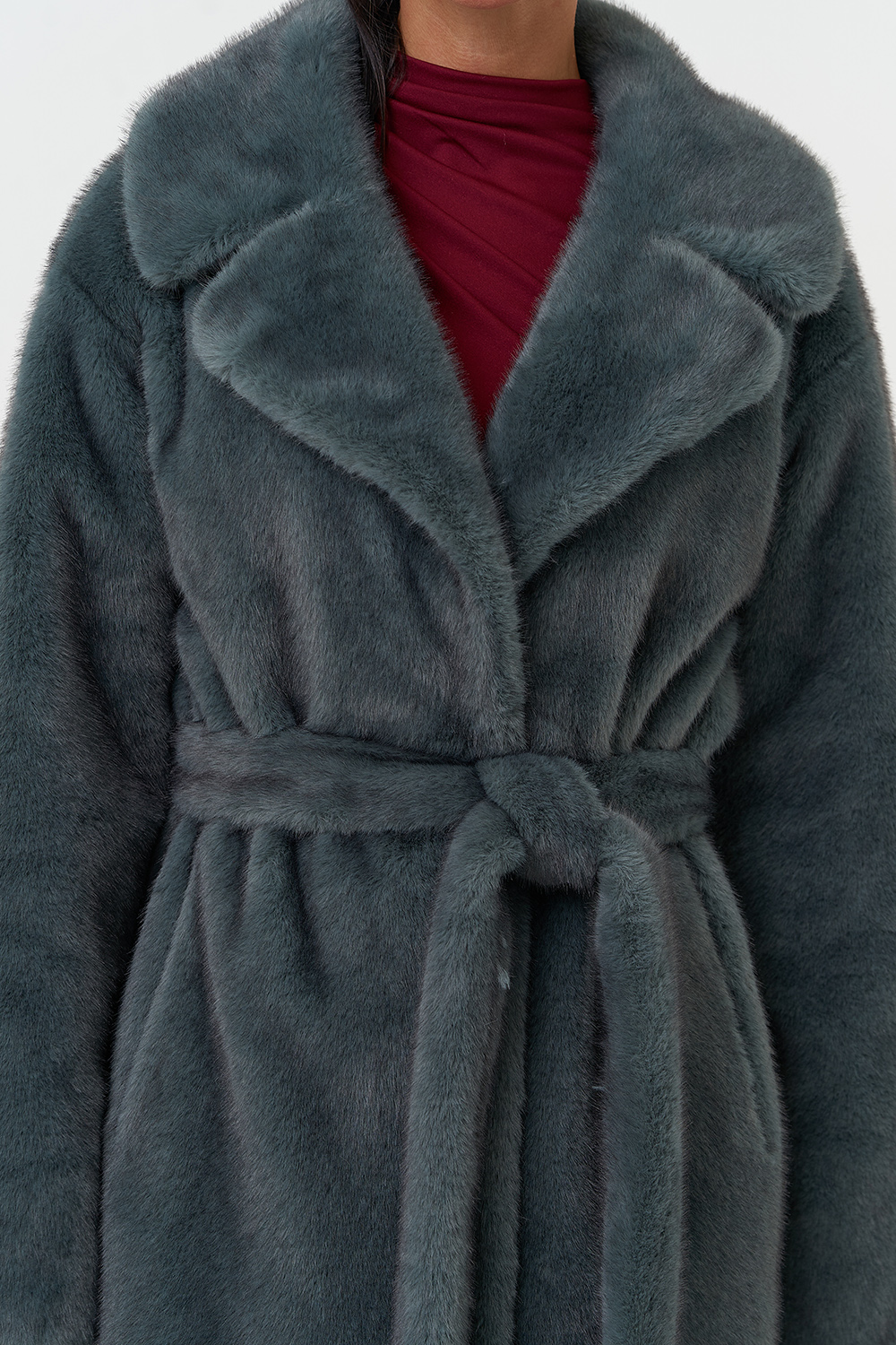 Фасон - прямой Длина изделия - 130 см Цвет - зеленый (ментол) Материал - экомех Состав полотна - полиэстер 100% Подкладка - полиэстер 100% Вид застежки -крючки, пояс Вид ворота - английский воротник Фасон рукава - втачной, длинный |